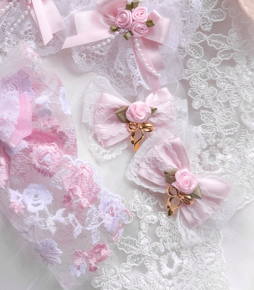 A pretty set of ballerina pink ribbon and lace bows, each crowned with a delicate rose & gold ribbon charm.